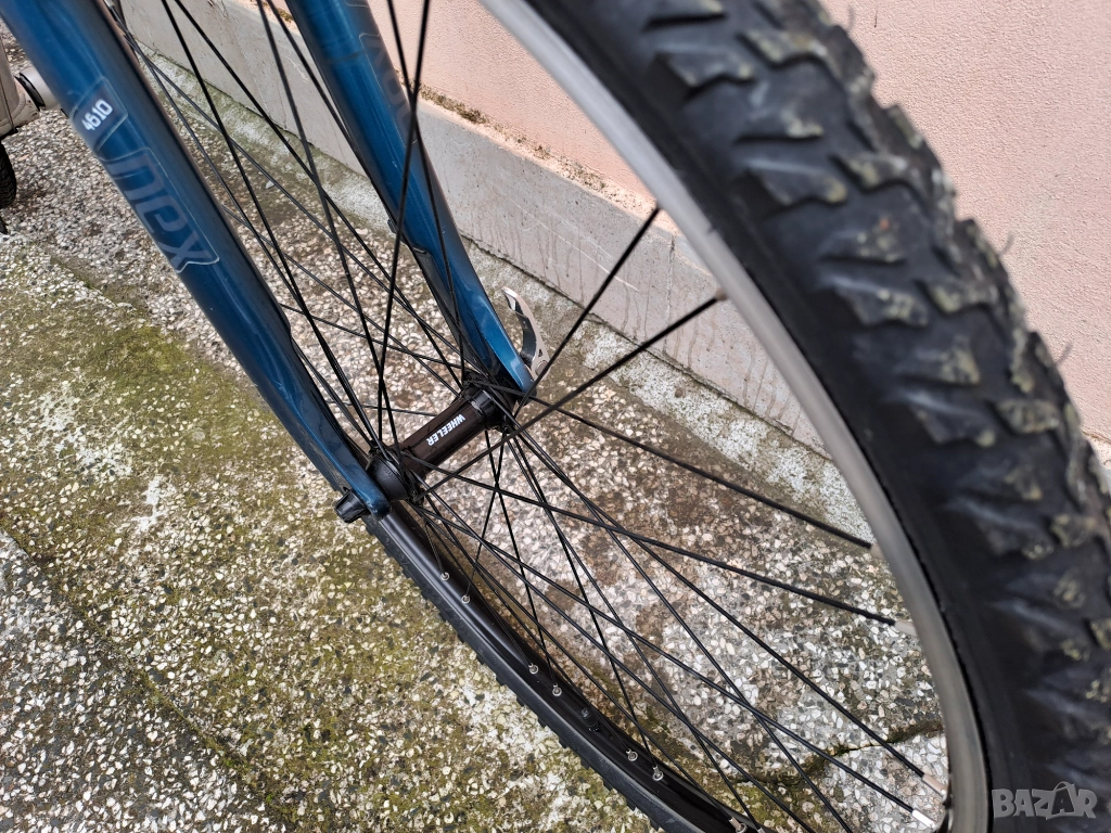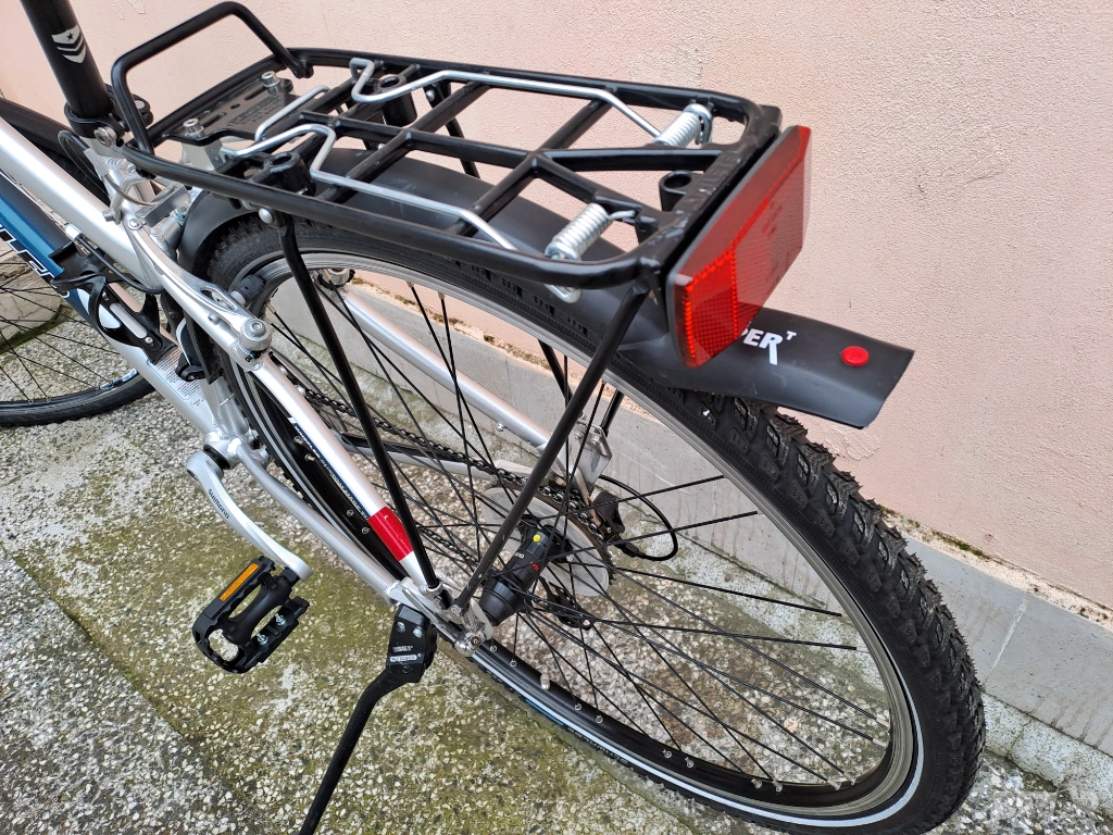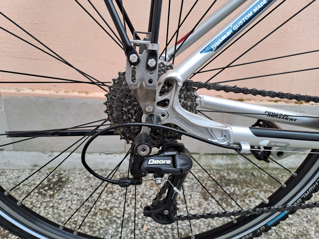 Алуминиев градски велосипед с гуми 28 цола. Скорости Shimano Deore 3x9. Амортисьорна вилка със заключване. Отлично състояние, може да се види в Поморие.