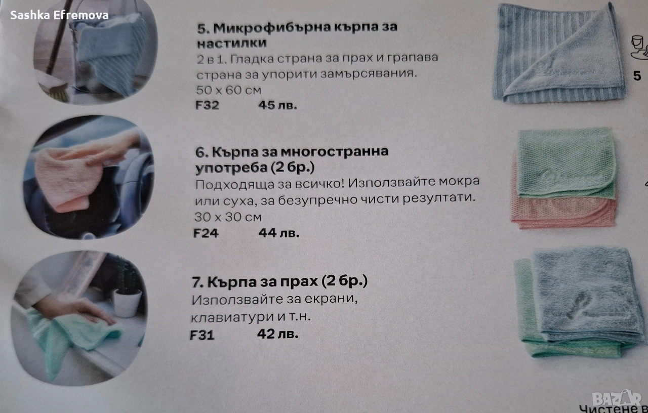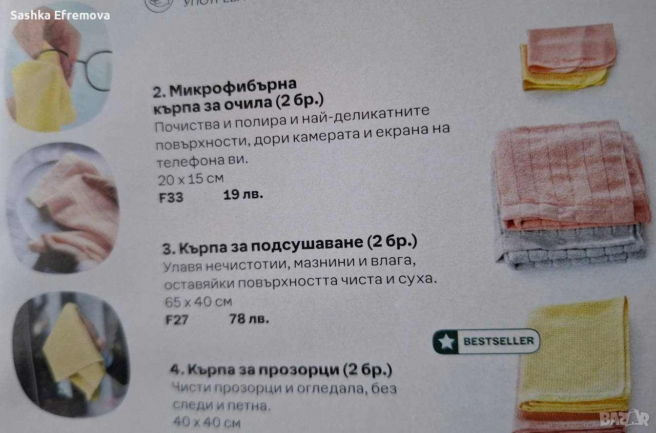3. Кърпи за очила 2бр.- 10 евро. 4.Кърпа за прозорци 1бр. - 18евро. 5.Кърпа за подсушаване 1бр. - 19 евро. 6.Универсална кърпа 1бр.- 12 евро.