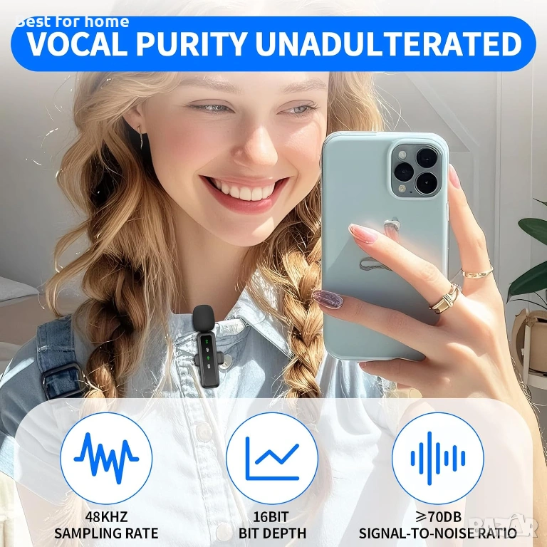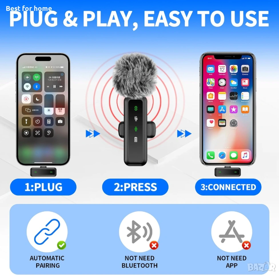 Plug & Play – Светкавично свързване: Без нужда от Bluetooth или допълнителни приложения. Просто включете приемника в телефона и започнете записа.