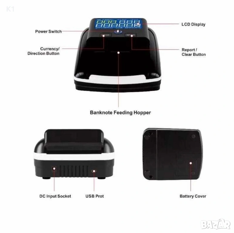 Дигитален уред за броене на банкноти и разпознаване на купюри в евро и долари всяка банкнота минава през пет степенна верификация.