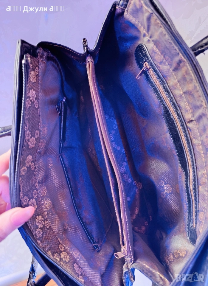 Вътре е с две основни отделения, по средата има голям джоб с цип, има и по - малки джобове за телефон и червило