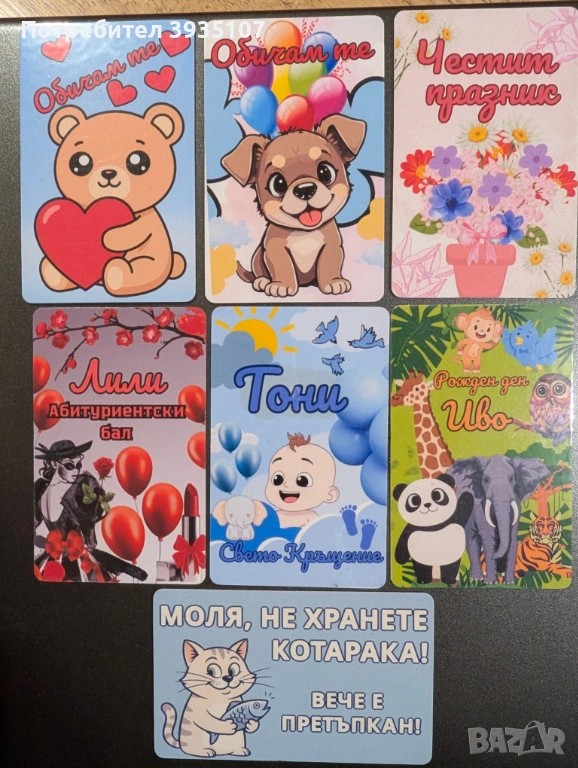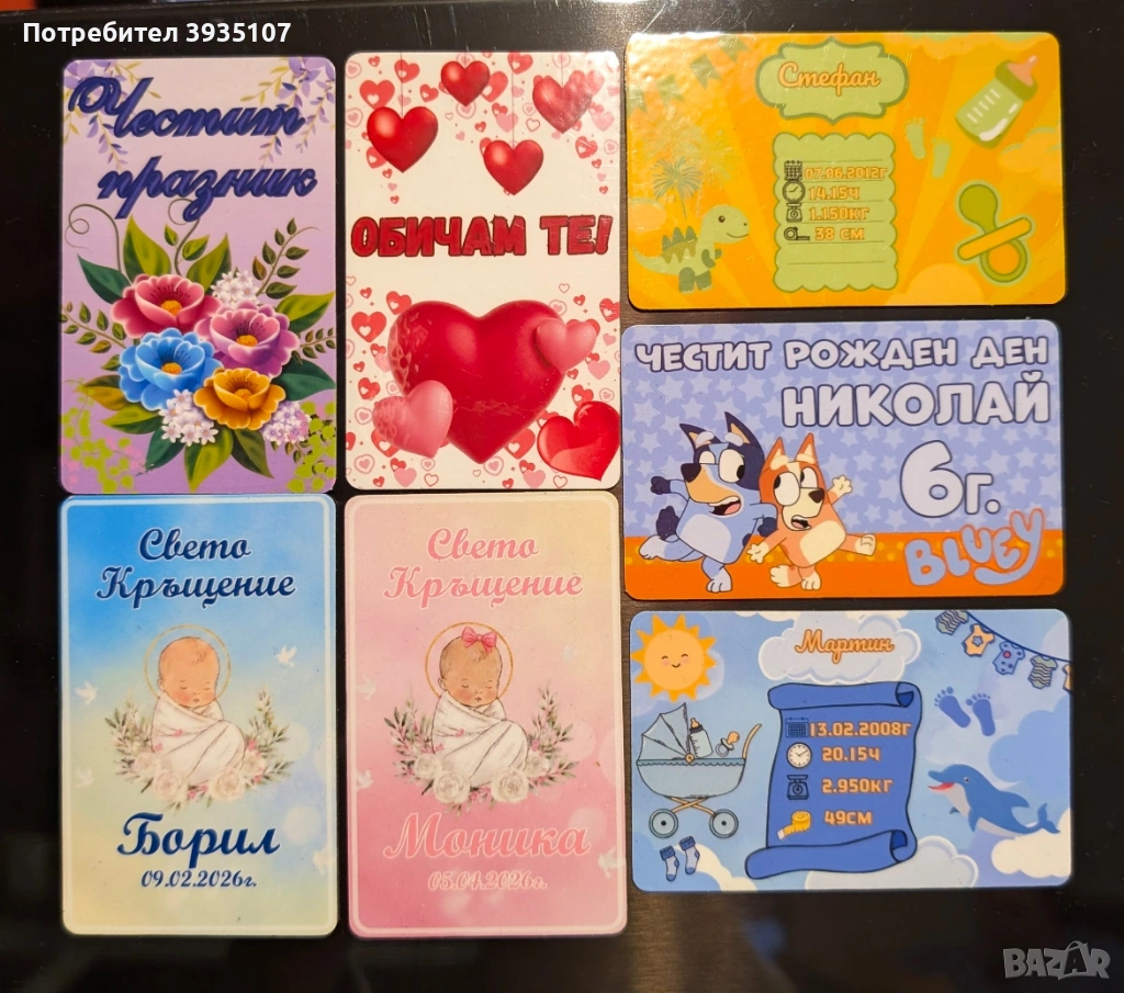 Магнит за хладилник. Изработват се по поръчка. Подходящи за подарък за кръщене,бал, рожден ден, 8-ми март, юбилей, персонализирана бебешка визитка, св. Валентин и други. Цена 2-3 лв.