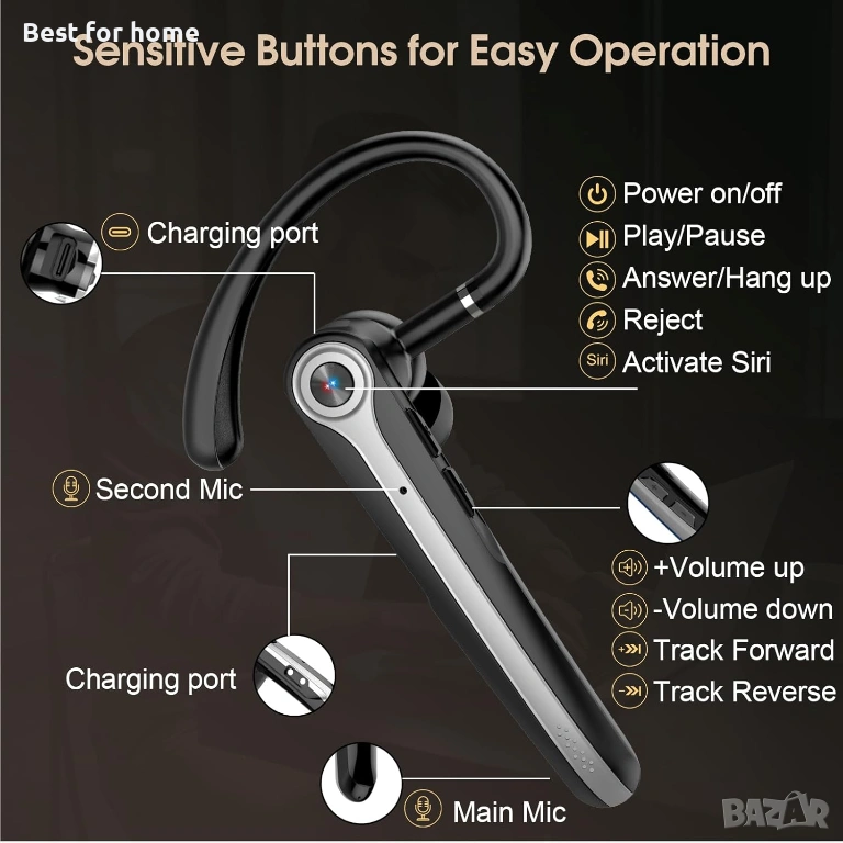 Интуитивно управление: Бутони за регулиране на силата на звука, приемане/прекратяване на разговори и управление на музика – лесно за работа дори в натоварени ситуации.