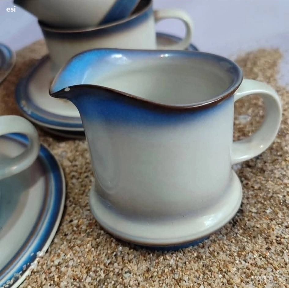 Goebel, Германия 💙🤎🩵 Винтидж порцеланов сервиз Goebel – оригинално германско производство. Сервизът е изработен от висококачествен порцелан в класически дизайн с мека синя преливка по ръбовете и леко матова глазура. ☕ 5 чаши с чинийки 🥣 Захарница с капак Каничка за мляко с малко чипче 🩵 Стил: Ретро / Модернистичен минимализъм 📍 Произход: Goebel, Германия 🕰 Период: около 1960–1980 г. ⚙️ Състояние: Отлично за възрастта си – без пукнатини или отчупвания, само леки следи от употреба Обща цена 25,56 € / 50 лв