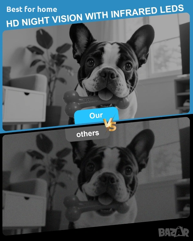 Автоматично нощно виждане: Вградени инфрачервени LED диоди за ясна картина дори при пълен мрак, без да излъчват видима светлина (дискретно наблюдение).