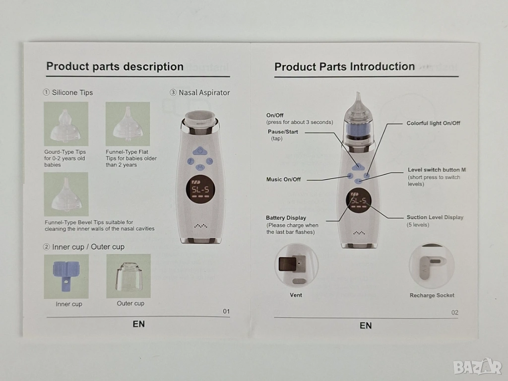Електрически аспиратор за нос, предназначен за бързо и нежно почистване на запушени носове при бебета и малки деца. Устройството е проектирано с акцент върху комфорта на детето, включвайки успокояващи функции като музика и светлини.