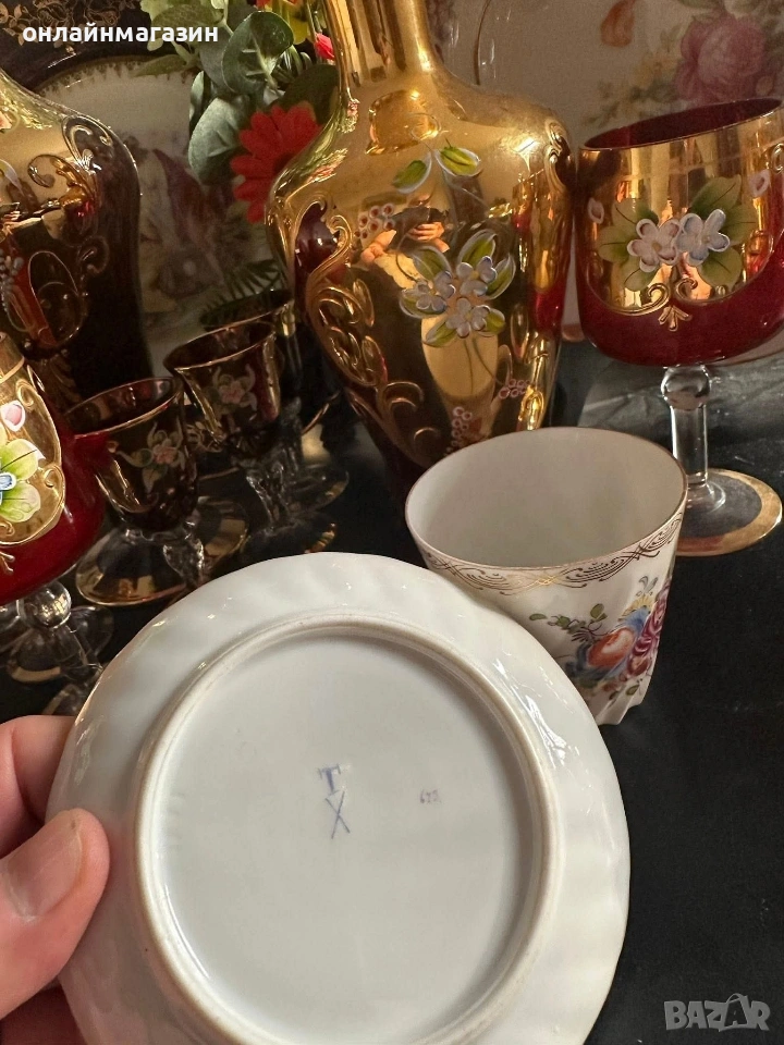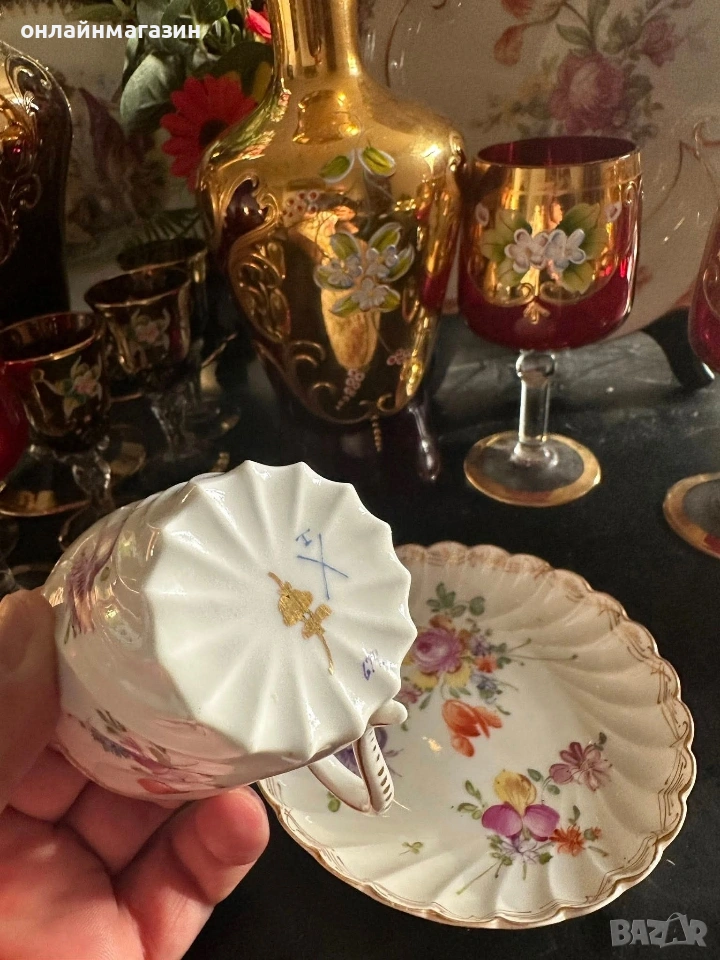 Dresden Germany Circa 1901 The Carl Thieme porcelain company was founded in 1886(or 1836) in Potschappel, Saxony, Germany, by Carl Thieme - невероятно красив двоен сета, с ръчно нарисувани букети и цветя, феерия от багри и класа, великолепие от историята с вместимост от 175 мл,отлично качество и състояние, безценна немска презантация на арт класика.