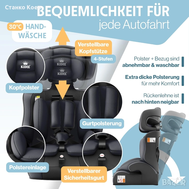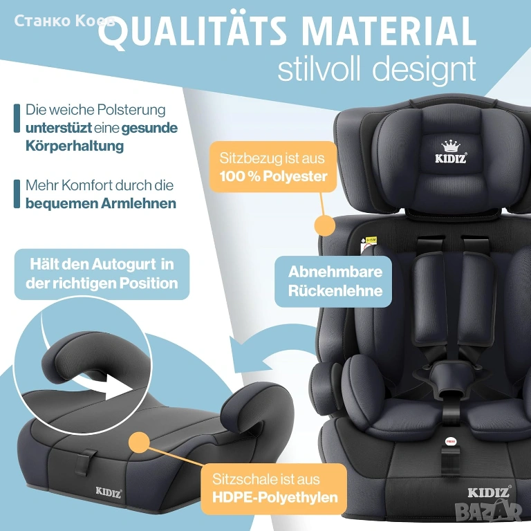 Висококачествено столче за кола Kidiz за деца на възраст 1-12 години.