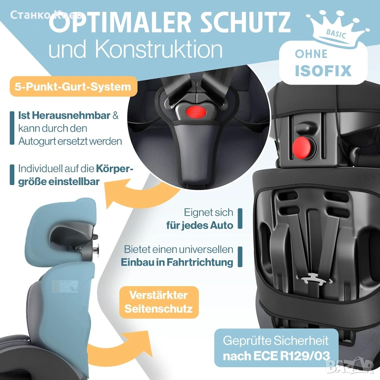 Столчето за кола е тествано и одобрено съгласно ECE R129/03 - (Група 1+2+3), телесно тегло 9-36 кг – приблизително 1-12 години).