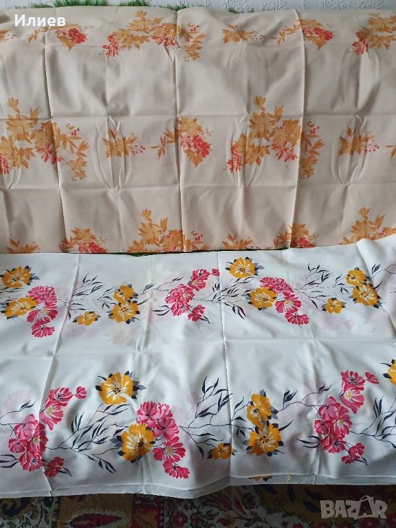 Две красиви неизползвани покривки за маса с есенни мотиви. Едната е с оранжево-червени листа, а другата с цветя в розово, жълто и бяло. Подходящи за домашна употреба или за декорация. Размери на покривката с оранжев нюанс 140 х 130 см, а на другата 169 х 140 см. Ценана на първата е 4 €, на втората 5 €.