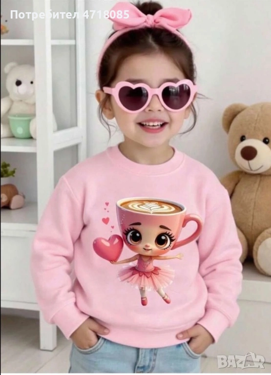 Очарователна детска блуза в нежен розов цвят с уникален принт на сладка балеринка с глава на чаша кафе и сърце в ръка! Перфектен избор за малки дами, които обичат стилни, забавни и приказни визии.