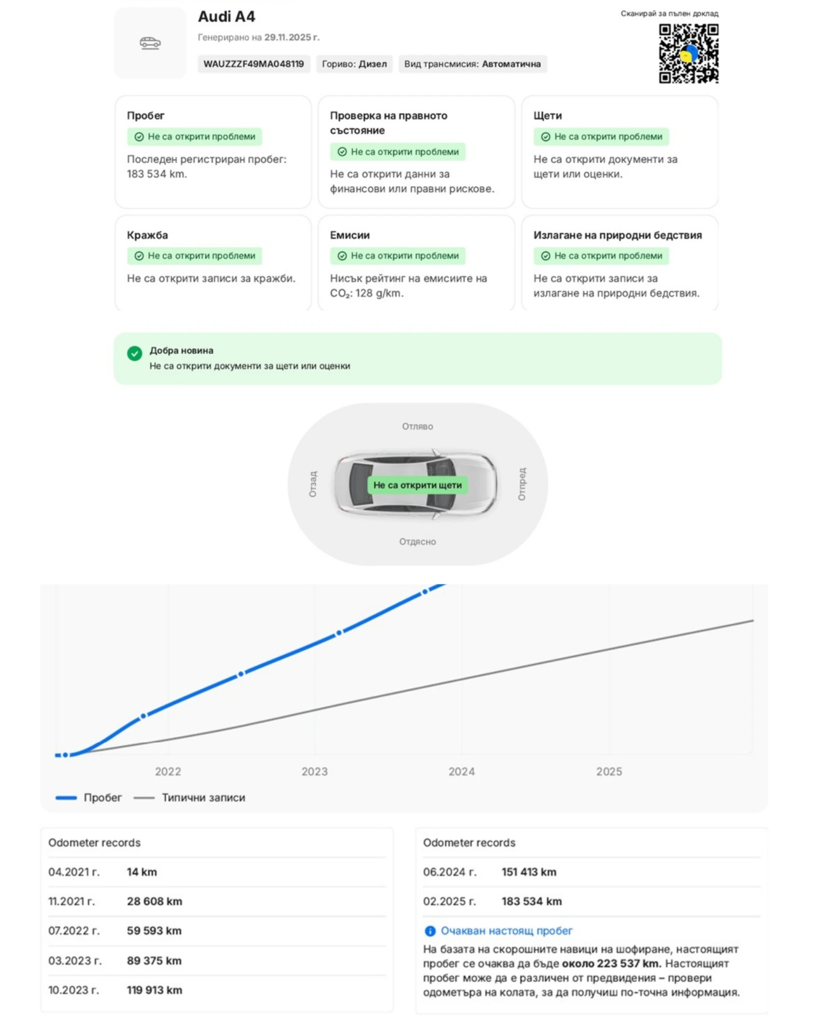 ! ! -1000 EUR от цената само до 15. 02. ! ! Стара цена: 25 900 EUR ↘️ 24 900 EUR - Представяме Ви проверен, употребяван автомобил, наличен в гр. Русе. - Закупен от официално представителство на Audi. - 100% гаранция за пробега на автомобила, който се доказва с история на ежегодишните технически прегледи, достъпни от доклада в системата CarVertical. - Пълна сервизна история в Audi, за което разполагаме с нужните разпечатки и може да бъде направена справка във всяко представителство на марката чрез рамата, която сме посочили в обявата. - Последно обслужване на двигателя: на 19. 02. 2025 г. на 183 553 км - Последно обслужване на скоростната кутия: на 10. 10. 2023 г. на 119 932 км - Автомобилите, които предлагаме за продажба са внимателно подбрани и селектирани, така че да задоволят изискванията и на най-взискателните клиенти. След доставката си в нашата база, всеки автомобил преминава пълна проверка и диагностика на всички системи и агрегати, както и тестово шофиране в градски и извънградски условия, за да се уверим, че ще закупите от нас проверен автомобил в напълно изрядно техническо състояние! - Масс Ауто е официален партньор на Уникредит лизинг, Алианц лизинг, ОТП лизинг, Uplease и Maxo. BG. - Възможен лизинг без доказване на доходи, само срещу лична карта, 100% одобрение! - Продажба с договор и фактура (без нотариални такси). - За Ваше удобство и сигурност предлагаме опция за видео разговор, в който ще можете да разгледате подробно автомобила, както и да видите как колата пали, как работят агрегатите и всички системи и екстри. - Ако имате каквито и да е въпроси относно автомобила или начините на финансиране - не се колебайте, а се свържете с нас - ще Ви разясним всичко до последния детайл. ___________________________ ДОПЪЛНИТЕЛНА ИНФОРМАЦИЯ: - Фабричен пълен S-line оптичен пакет - Shadow Line пакет екстериорни елементи в черен пиано лак - Интериорен пълен S-line пакет - Спортен салон от кожа и алкантара с контрастни бели шевове - Оригинални 19 цола Audi Sport джанти със зимни гуми Michelin - Спортен S-line трилъчов кожен волан - Многоцветно интериорно амбиентно осветление - Адаптивно окачване с регулиране на твърдостта - Най-високото ниво изцяло лед " MAТRIX" фарове с асистент за дълги светлини, отсичане на лентите и " бягащи" мигачи + анимация - Full LED стопове с " бягащи" мигачи + анимация - Дистроник - активен автопилот - Най-високото ниво за модела мултимедийна и навигационна система - 3-зонов дигитален климатроник - Камера на заден ход - Keyless GO - безключов достъп и палене - Електрически регулируема шофьорска седалка - Подгрев на предните седалки - Фабрично затъмнени и термоизолирани стъкла - Електрическа врата на багажника - Преден и заден парктроник с визуализация - Станция за безжично зареждане на телефони - Пера за превключване на скоростите от волана - Слотове за SD карти и SIM карта - Aux и USB входове - Сензори за светлина и за дъжд - Активен асистент за пътни ленти - Асистент за мъртви точки - Асистент за разпознаване на пътни знаци - Вътрешно и странични огледала с автоматично затъмняване - Състема за подпомагане на водача и система за защита на пътниците - Isofix стойки за детска седалка