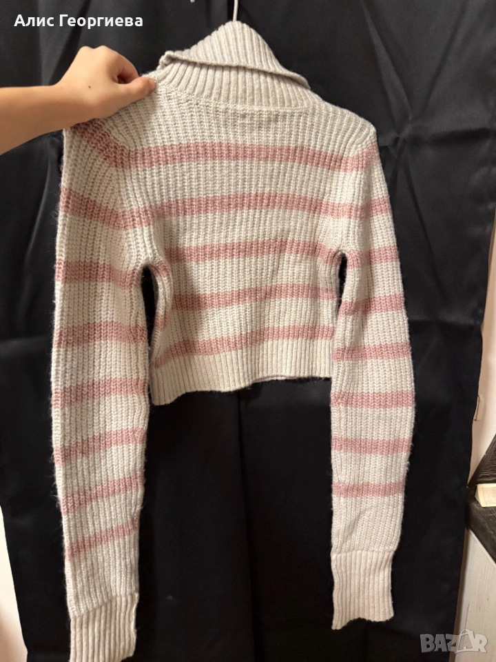 Бяло-розов пуловер- късичък. Без забележки. Ако имате въпроси, не се колебайте да ми пишете.