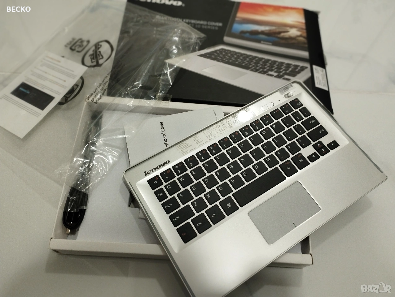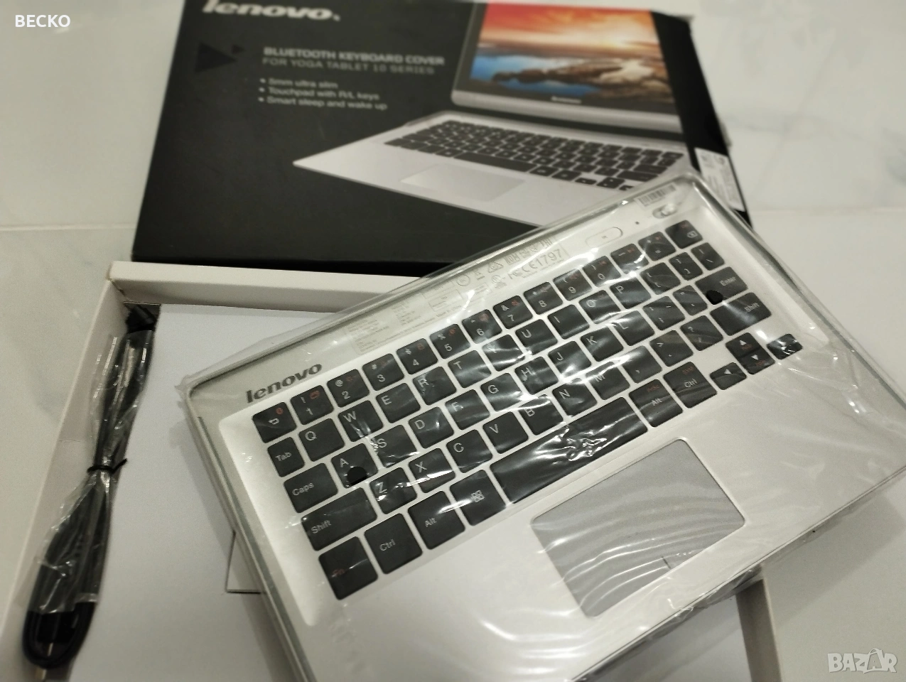 клавиатура-капак на Lenovo, специално проектирана за таблетите от серията Yoga Tablet 10 (като моделите B8000 или Yoga Tablet 2 10.1). Ето подробно описание на нейните характеристики и функции въз основа на опаковката и спецификациите на модела: ## Основни характеристики Тип 2-в-1: Тя служи едновременно като безжична клавиатура и като защитен преден капак за екрана на таблета, когато не се използва. Дизайн: Изключително тънка (само 5 мм) и лека, за да не добавя излишен обем към устройството. Материали: Обикновено е изработена от качествена пластмаса с метален завършек, който пасва на естетиката на Yoga серията. ## Функционалност Тъчпад: Клавиатурата разполага с вграден тъчпад с десен и ляв бутон (R/L keys), което превръща таблета в почти пълноценен лаптоп. Smart Sleep/Wake: Магнитна функция, която автоматично приспива таблета при затваряне и го „събужда“ при отваряне на капака. Свързаност: Използва Bluetooth технология, което означава, че може да работи с таблета дори ако той не е физически прикрепен към нея. Клавиши: Нископрофилни клавиши (тип "Chiclet"), оптимизирани за бързо писане, въпреки компактния размер. ## Предимства Защита: Предпазва дисплея от надраскване при пренасяне. Магнитно закрепване: Горната част на клавиатурата има специфичен жлеб/магнит, който се захваща за характерния цилиндричен долен край на Yoga таблета. Автономия: Има собствена вградена батерия, която се зарежда чрез Micro-USB порт. ## Важни уточнения [!IMPORTANT] Тази клавиатура е проектирана за по-старите модели Yoga Tablet 10. Ако планирате да я купувате за по-нов модел (например Yoga Tab 11 или 13), тя вероятно няма да пасне физически като капак, въпреки че самата Bluetooth функция ще работи.