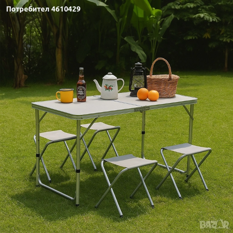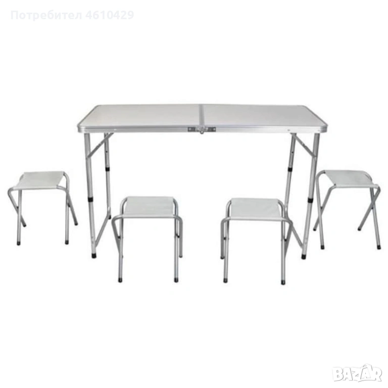 Комплект сгъваема алуминиева маса с 4 стола – идеален за къмпинг, двор и почивка, снимка 1 - Градински мебели, декорация  - 53214477 Комплект сгъваема алуминиева маса с 4 стола – идеален за къмпинг, двор и почивка, снимка 2 - Градински мебели, декорация  - 53214477 Комплект сгъваема алуминиева маса с 4 стола – идеален за къмпинг, двор и почивка, снимка 3 - Градински мебели, декорация  - 53214477 Комплект сгъваема алуминиева маса с 4 стола – идеален за къмпинг, двор и почивка, снимка 4 - Градински мебели, декорация  - 53214477 Комплект сгъваема алуминиева маса с 4 стола – идеален за къмпинг, двор и почивка, снимка 5 - Градински мебели, декорация  - 53214477 Комплект сгъваема алуминиева маса с 4 стола – идеален за къмпинг, двор и почивка, снимка 6 - Градински мебели, декорация  - 53214477 1/6