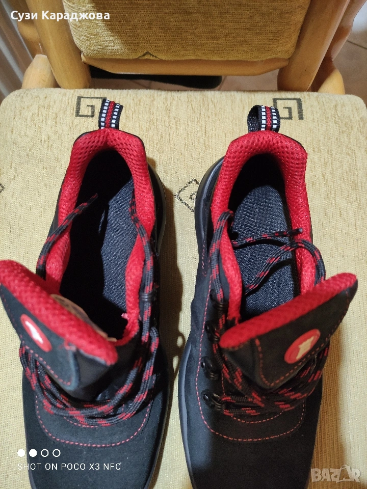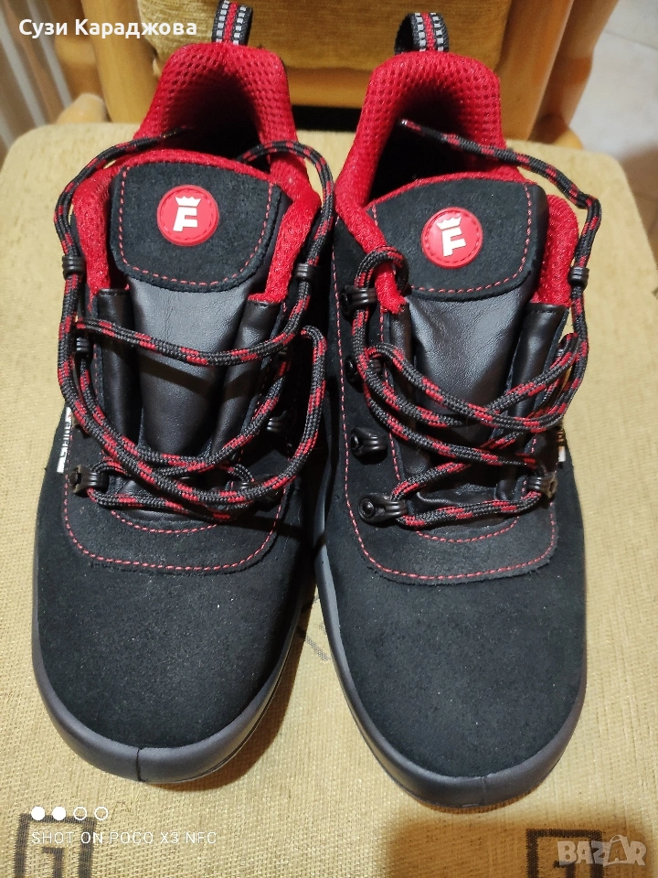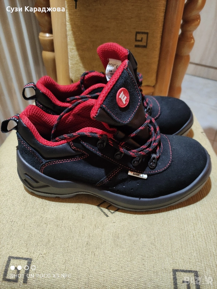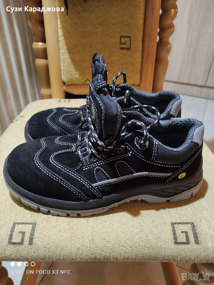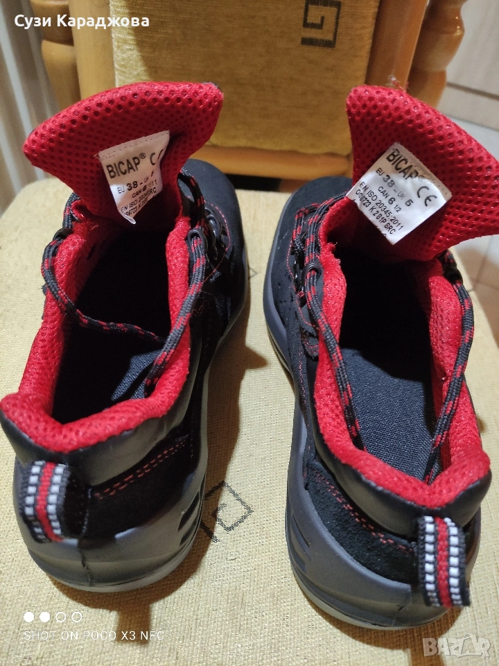 Обувките имат външен вид и дизайн на спортни обувки,които осигуряват пълна защита.Подметката е антистатична,противоплъзгаща.Имат композитно бомбе.Чифта е 20 евро.Черните са 38 номер,а черно червените са 40 номер.
