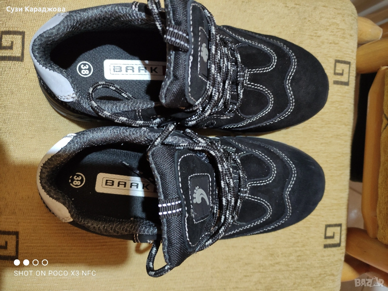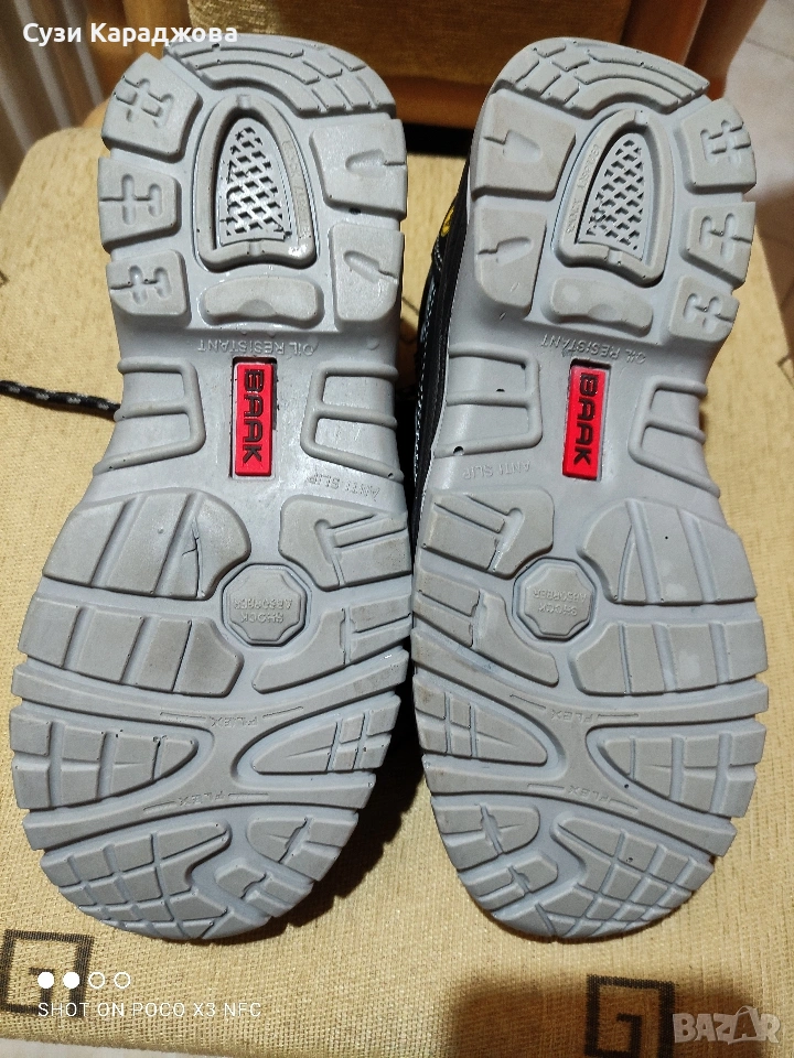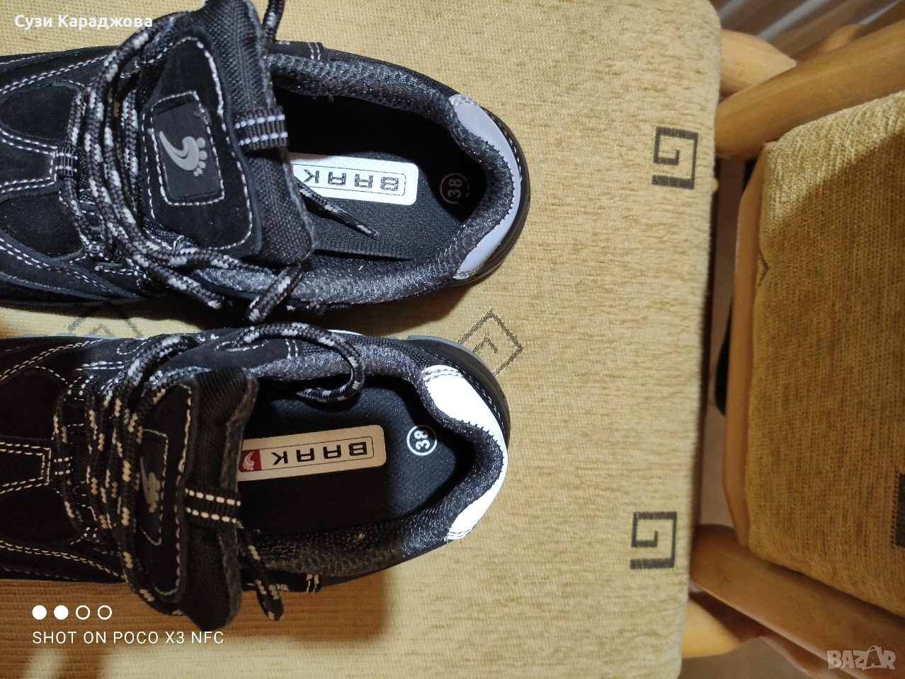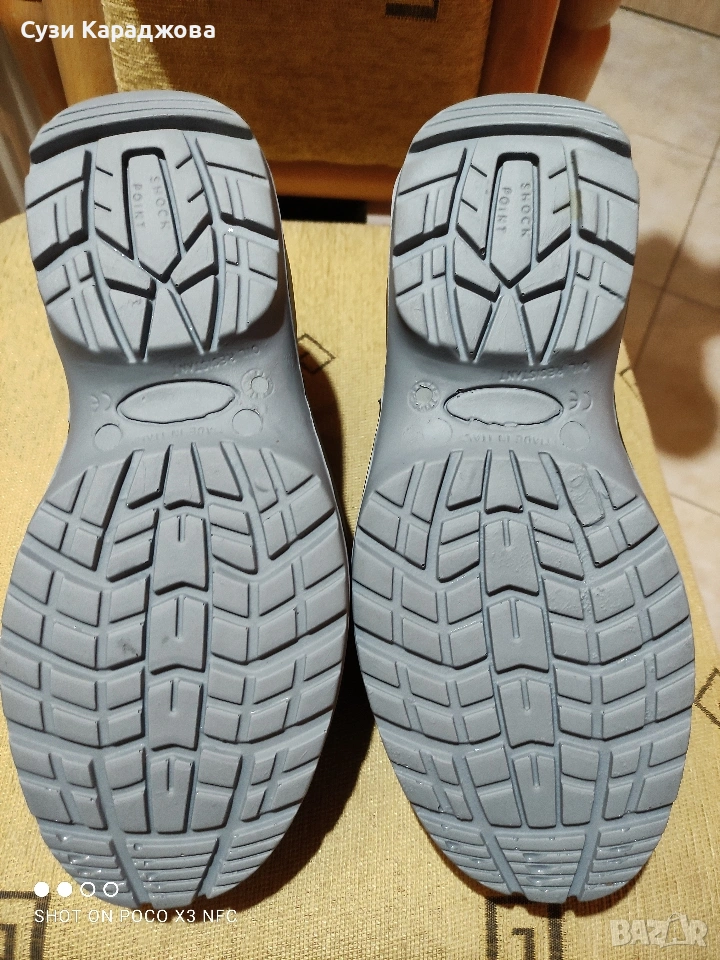 Обувките имат външен вид и дизайн на спортни обувки,които осигуряват пълна защита.Подметката е антистатична,противоплъзгаща.Имат композитно бомбе.Чифта е 20 евро.Черните са 38 номер,а черно червените са 40 номер.