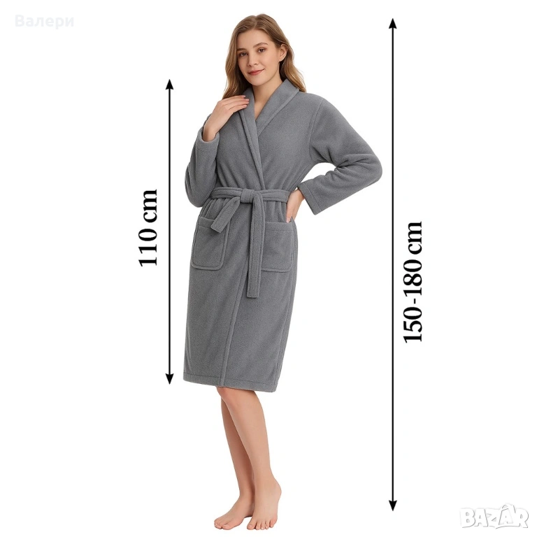 Дамски хотелски халат, класически, удобен, топъл, с връзки, мек, сив → Обява 53215502