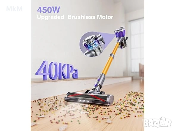 Безжичната прахосмукачка MBYULO се гордее с подобрен мотор с мощност 450 W и 3 регулируеми режима на засмукване, с максимална всмукателна мощност от 50000 Pa. Почиства лесно килими, дървени подове, плочки, козина от домашни любимци и трохи, което го прави идеален за единични апартаменти, домове за домашни любимци и лесна за ползване от възрастни хора .