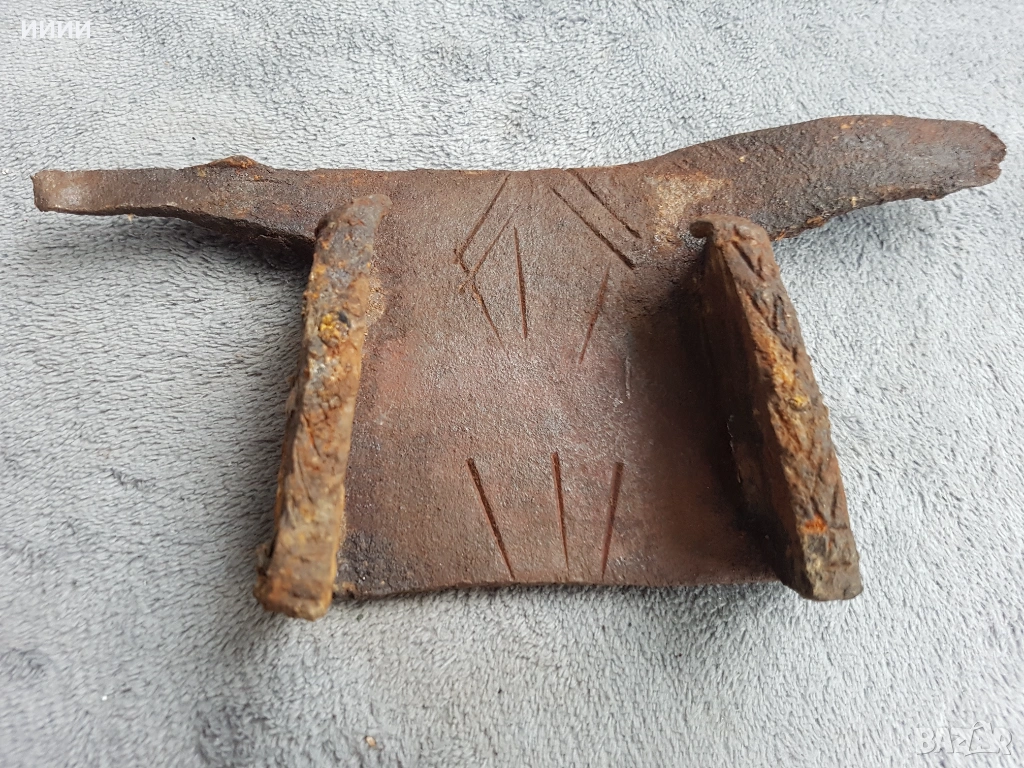 Ръчно изковано през 19-ти век. Примитивно, двустранно ръчно гравирано. Слагало се е пред ралото, да разбива буците пръст. Рядка антика.