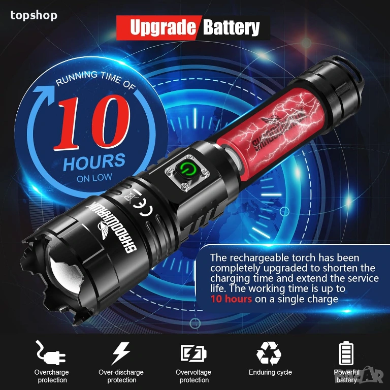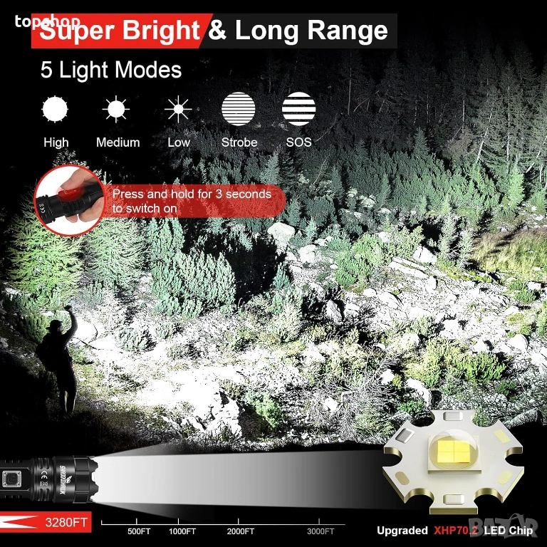 Невероятна мощност: Оборудван с модернизиран чип XHP70.2, фенерът е до 10 пъти по-ярък от обикновените модели. Осветява лесно площ от 120 кв.м. и има обхват на лъча до 1000 метра.