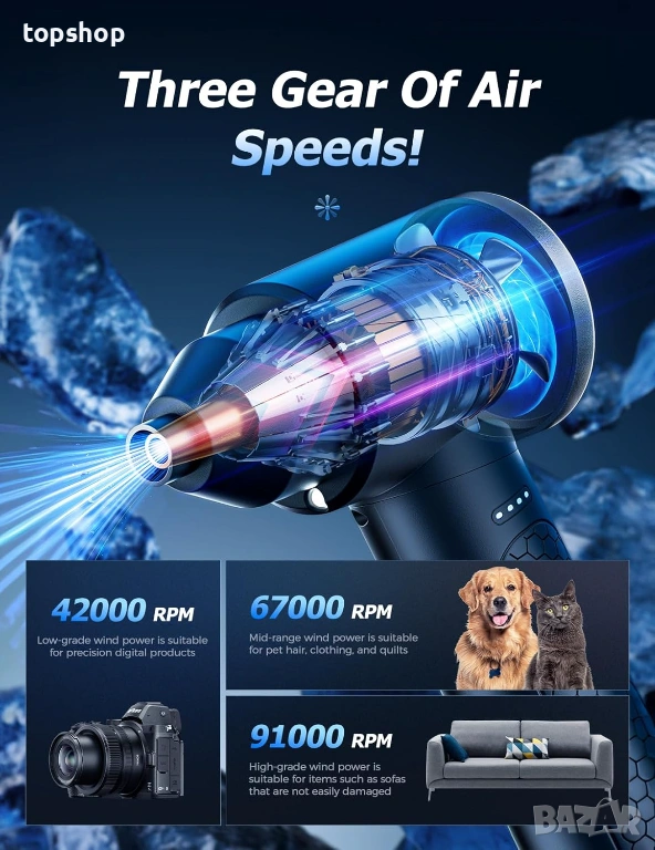 Изключителна мощност:Мотор с до 100 000 оборота в минута (RPM), който осигурява силна и концентрирана струя въздух за мигновено отстраняване на прах и мръсотия.