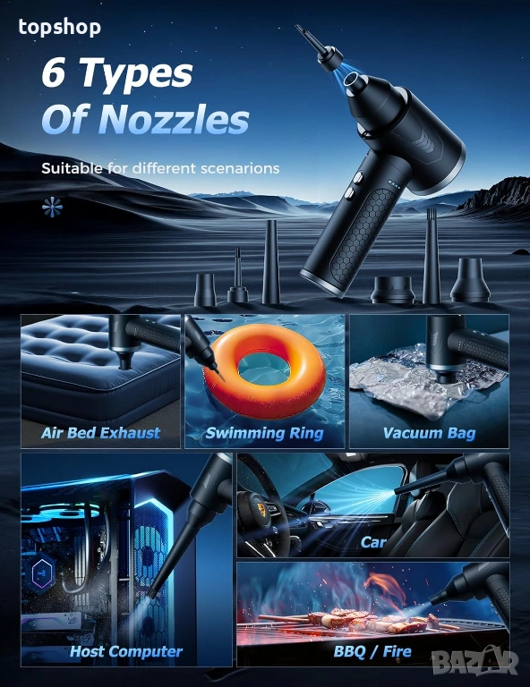 Многофункционален комплект: Включва 6 различни накрайника (дюзи), които го правят подходящ както за издухване на прах, така и за надуване на плажни принадлежности и други предмети.