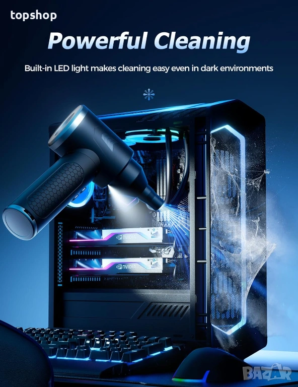 LED осветление:Вграден фар, който осветява тъмните ъгли (вътре в компютъра или под седалките на колата), за да видите и най-малката прашинка.