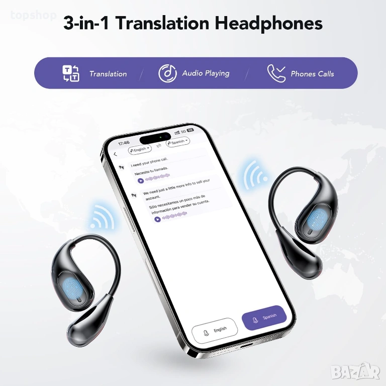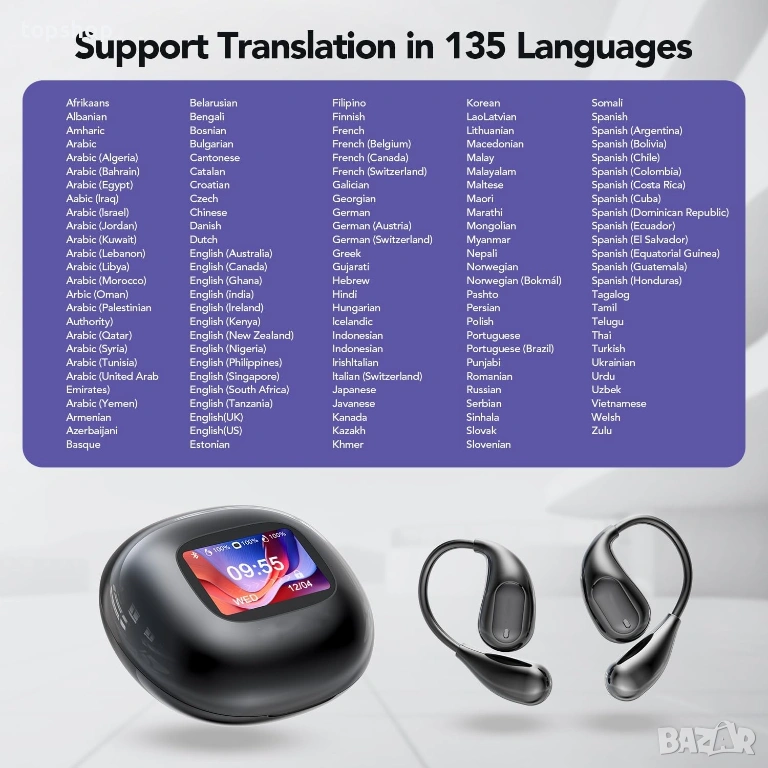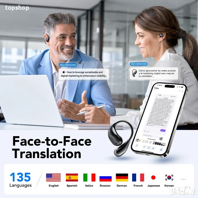 AI Превод в реално време: Поддържа двупосочен превод на 135 езика и акцента (включително български, английски, немски, френски, испански, руски, турски и много други). Идеални за пътуване, бизнес срещи и обучение.