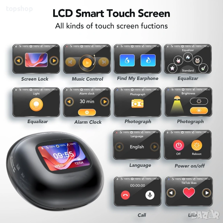 Смарт тъчскрийн на кутийката: Пълноцветен дисплей, чрез който управлявате силата на звука, сменяте песни, приемате повиквания, сменяте тапети и дори управлявате камерата на телефона си дистанционно.