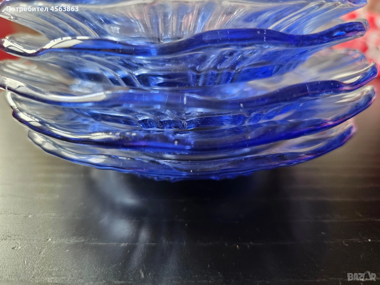 Красиво синьо стъкло. Сет от 5бр. чинийки с релеф и мънички крачета