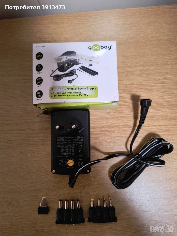 Goobay 53998 Универсално захранване 3 V - 12 V Max 27 W с адаптер 2 x Jack и 4 x DC щекера 600 mA → Обява 53217738
