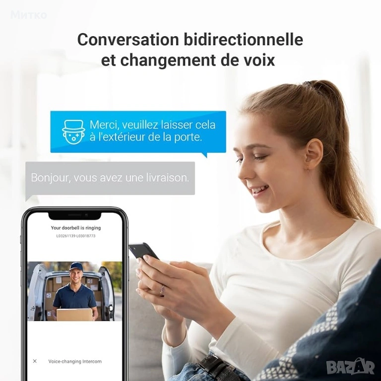 Двупосочна комуникация и смяна на гласа: Видеодомофонът EZVIZ CP5 гарантира, че няма да пропуснете никакви посетители, дори и да не сте си вкъщи. Можете да поддържате връзка с гостите си и да отваряте вратата дистанционно, просто с мобилния си телефон. Освен това можете да активирате функцията за смяна на гласа, когато говорите с непознати, за да останете анонимни и да добавите още един слой защита.