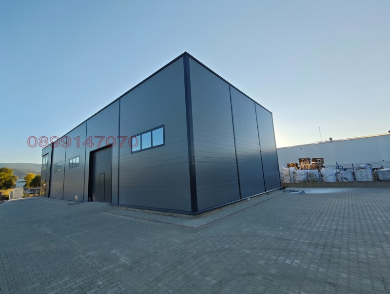 Настилка - шлайфан бетон. Паркинг - плац 500кв.м. Метална конструкция с 10 см. Термо панел. Височина 6-7 метра.
