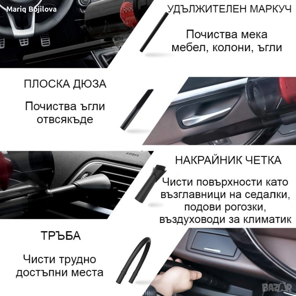 ⚜️Автомобилна прахосмукачка SONRU 7000Pa с мощност 150W Модела е снабден с медни намотки с висока производителност, а висококачествения меден мотор предлага мощност от 150W с пълна безопасност за вашия автомобил, силната всмукателна мощност от 7000Pa с лекота ще изсмуче всякаква мръсотия във вашата кола и ще ви случи добре за ежедневното и почистване. Също има опцията за мокро и сухо почистване , за да почистите хартия, косми, трохи, фасове, течност и прах. Прахосмукачката е много лесна за използване и с ниско ниво на шум. Просто трябва да я включите в запалката на колата и вече е готова за употреба. Име на продукта: Кабелна прахосмукачка; Марка: SONRU; Модел: SR16; Цвят: черен; ⚜️Аксесоари в комплекта: тръба, плоска дюза, накрайник четка и удължителн маркуч; Размер: 36 x 15,2 x 14,7 см; Тегло: 1,2 кг; Мощност на мотора: 150W; Измерена скорост: 29000 (r / min); Номинално напрежение: 12V; 70dB нисък шум; Мощност на засмукване: 7000pa; Почистване: мокро и сухо; Захранващ кабел: 4,5 см; Двойна система на филтриране; Диаметърът на удължителната тръба: 3 см; Диаметърът на плоската дюза: 2,5 см; Материал: пластмаса; Plug-in метод: Запалка на автомобил; Захранване: Електрозахранване на автомобила; Използване: на кола. 💰Цена: 62.98лв/ 32.20€