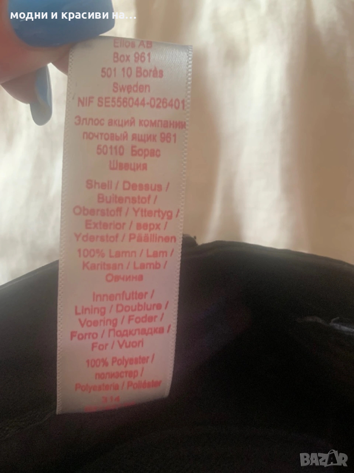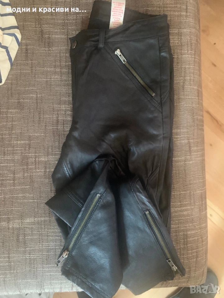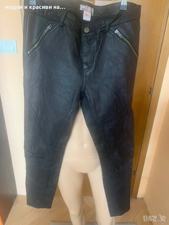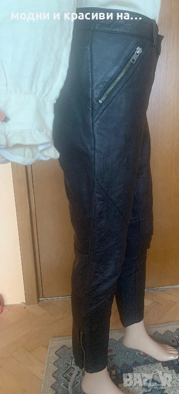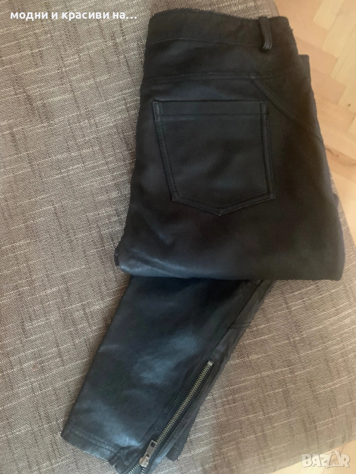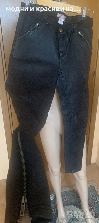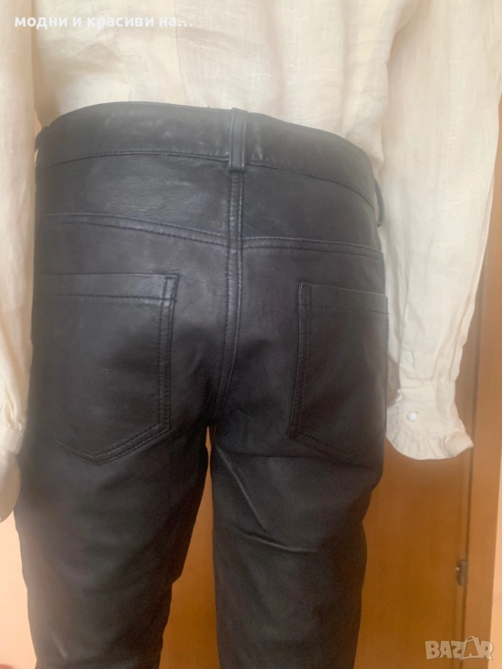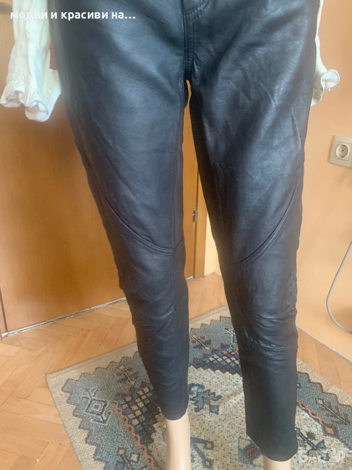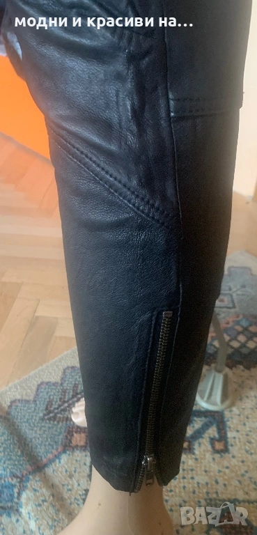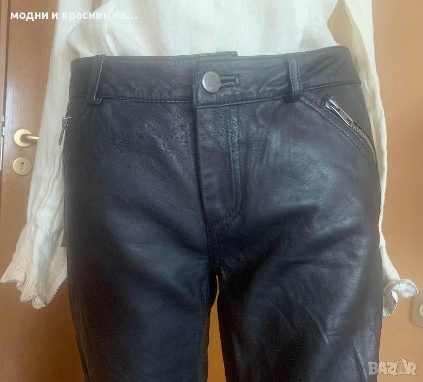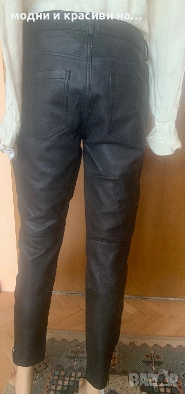 Панталонът е изработен от изцяло естествена овча кожа- плътна и здрава. Няма нищо общо с евтините имитации от еко кожа, чието ниско качество личи отдалеч и доста бързо се налага да излязат от гардероба следствие на грозно отлепваща се кожа.
