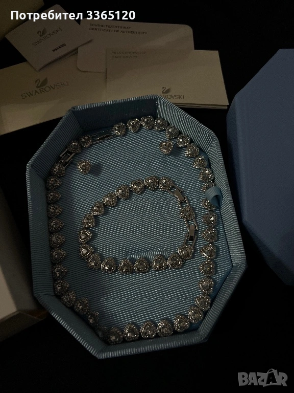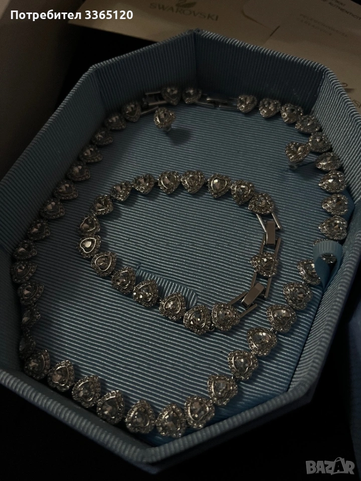 Продавам Swarovski комплект с кристали.Комплектьт включва обици и огьрлица и гривна , които с