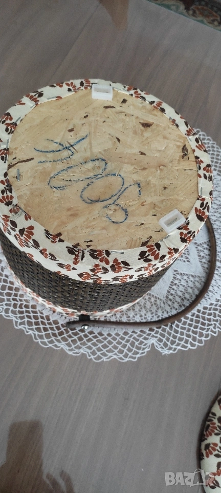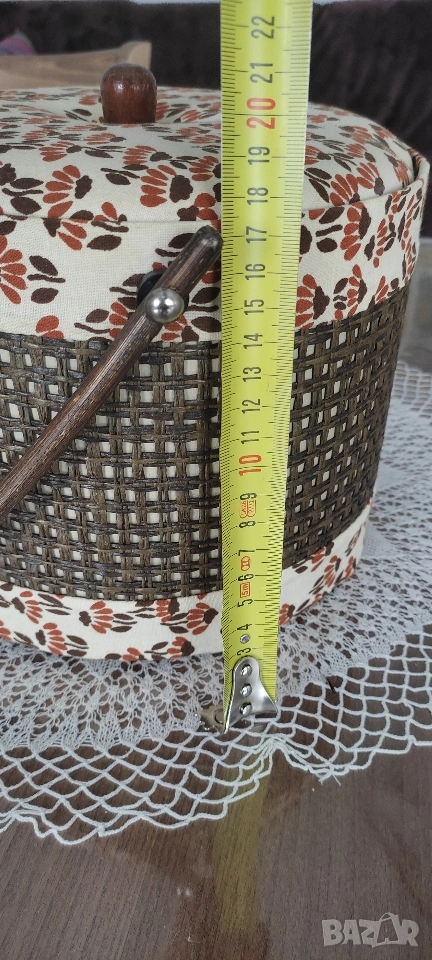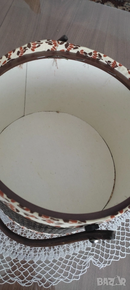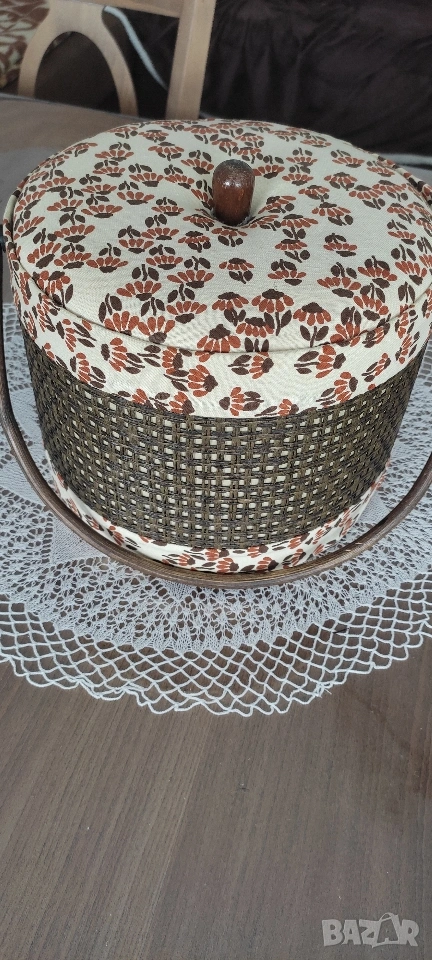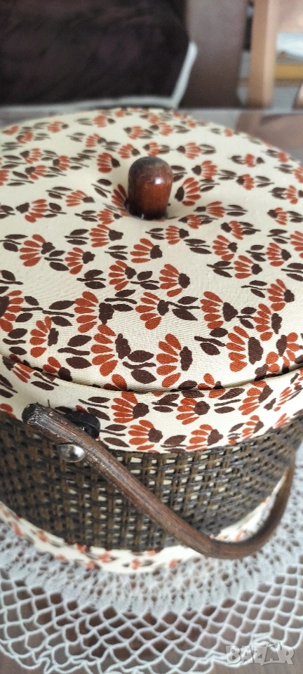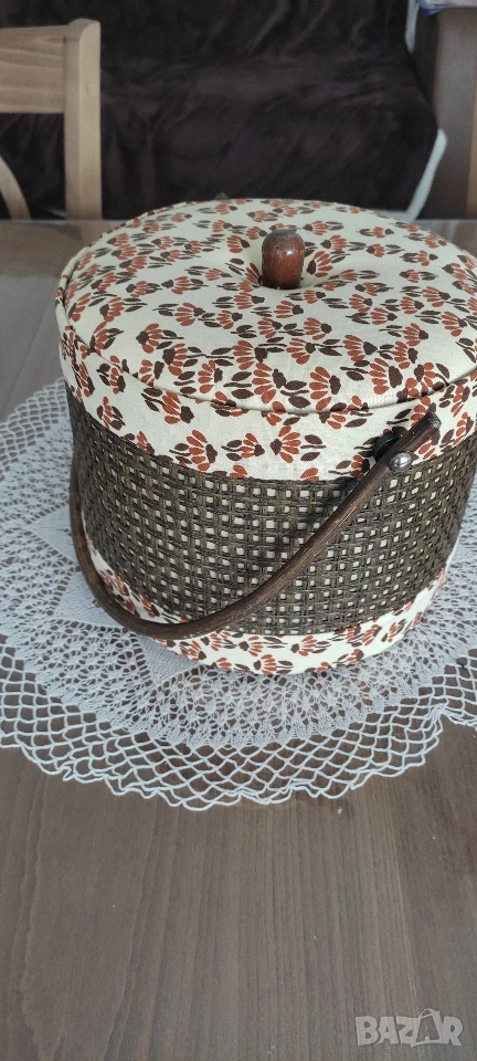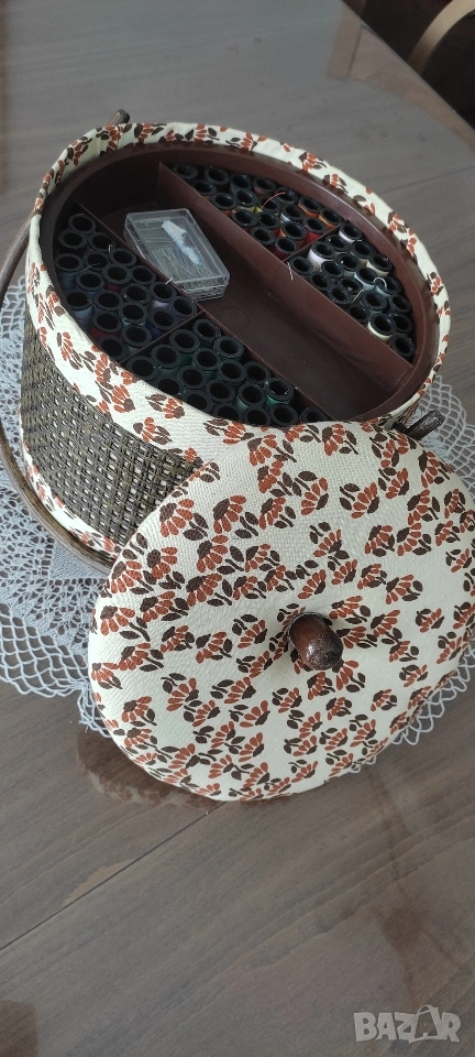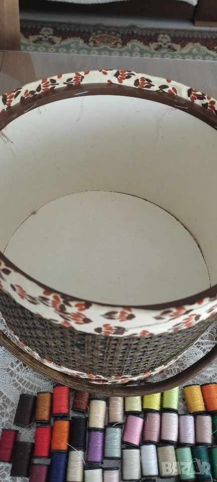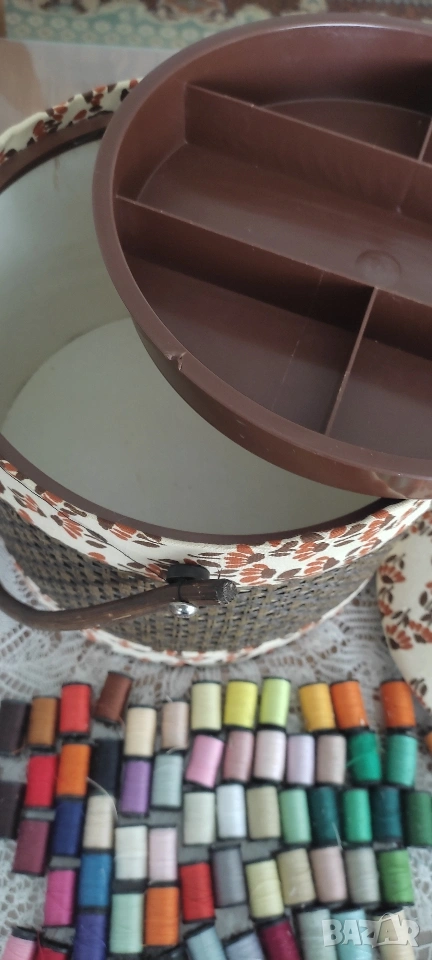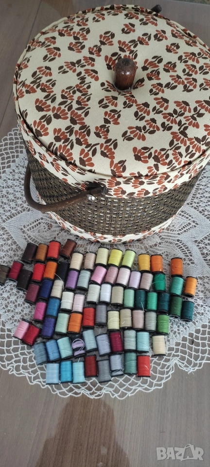 Ретро кутия/ кош/ органайзер за съхранение на шивашки материали. Продава се като комплект с включени над 70 макари. конец с различни цветове, кутийка с топлийки.
