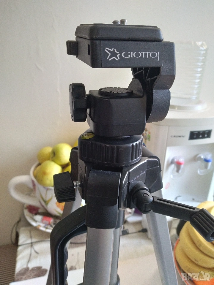 Статив за камери и фотоапарати и обективи с резба 1/4", произведен от Giottos. Алуминиева конструкция, предлагана в сребристо с черни акценти.