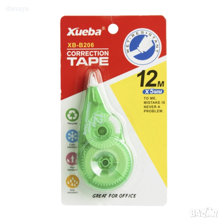 Коректор лента Xueba XB-B206 е практичен канцеларски аксесоар за бързо и чисто коригиране на грешки върху хартия. Този тип коректор лента за училище и офис позволява корекция на текст, написан с химикал или мастило, като покрива равномерно без размазване и без необходимост от изчакване за изсъхване.