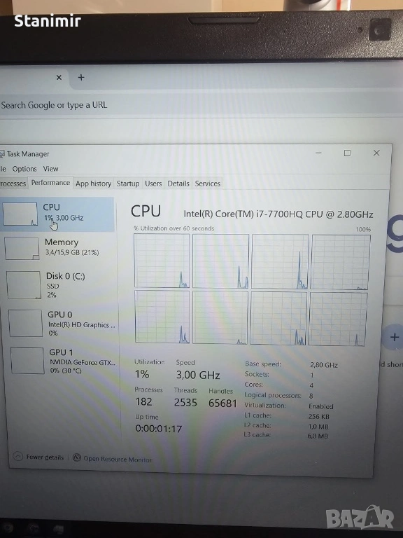 Процесор: Intel Core i7-7700HQ | Kaby Lake | Quad-Core (2.80 GHz up to 3.80 GHz, 6MB Cache,14 nm, 45W)