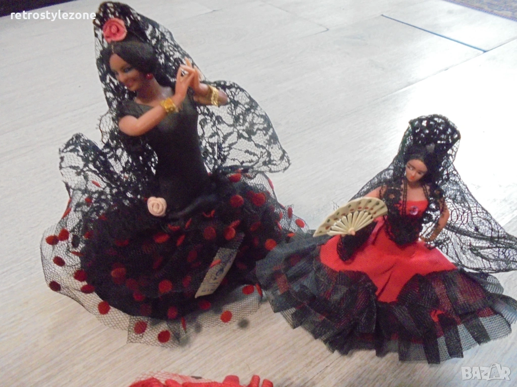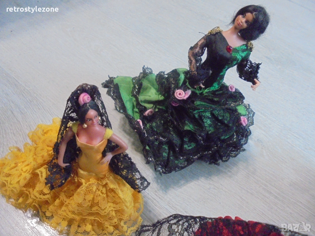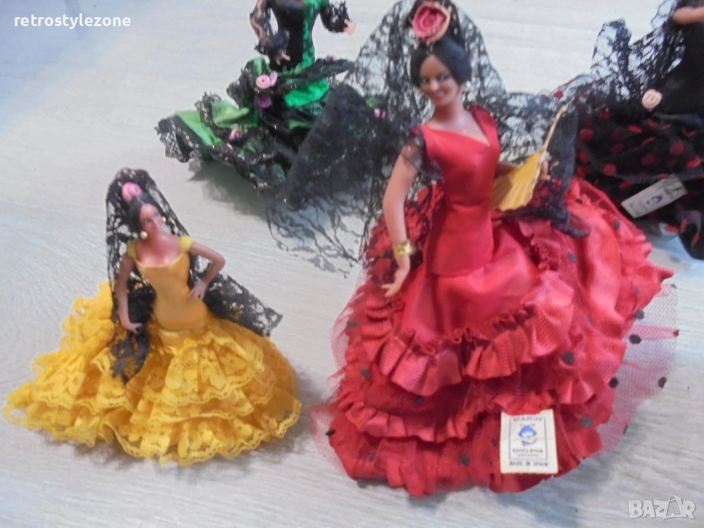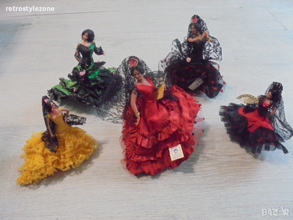 Стар оригинален колекционерски лот от 5 броя малки испански кукли MARÍN, представящи традиционни фламенко танцьорки в автентични рокли.