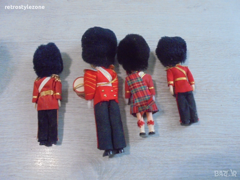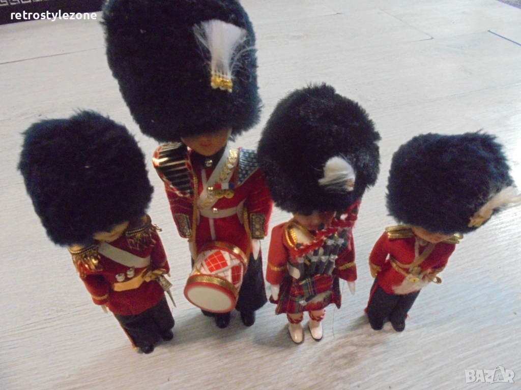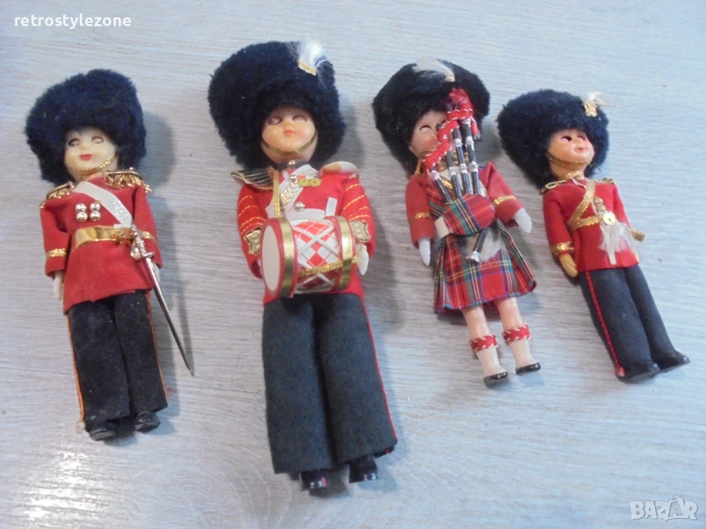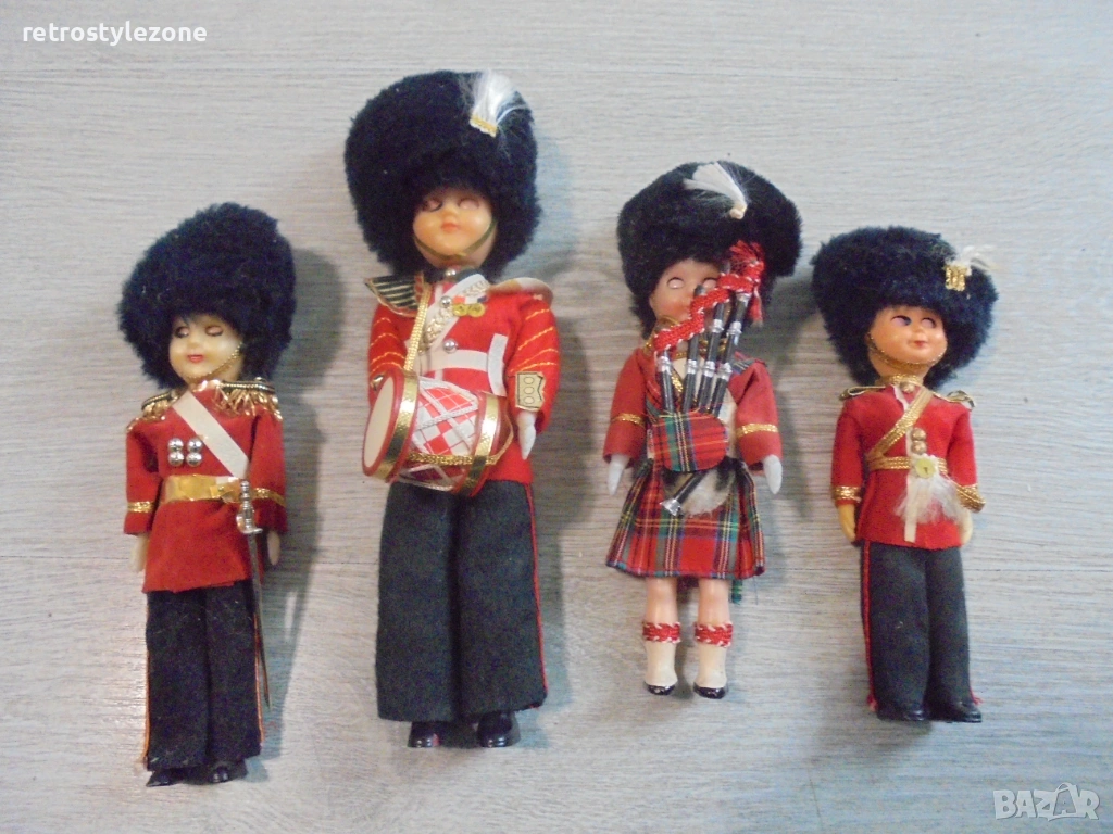лот от 4 броя стари колекционерски декоративни фигурки, изработени от синтетика и текстил, с характерни униформи и детайлни аксесоари.
