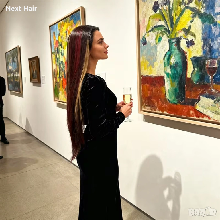 Елегантна и впечатляваща синтетична перука в наситен тъмно червен бордо цвят, обогатена с деликатни руси и кафяви кичури за по-естествен и модерен ефект. Косата е права, гладка и с дължина 80 см, която подчертава визията и придава драматичен стил.