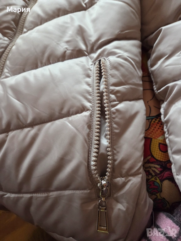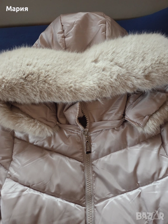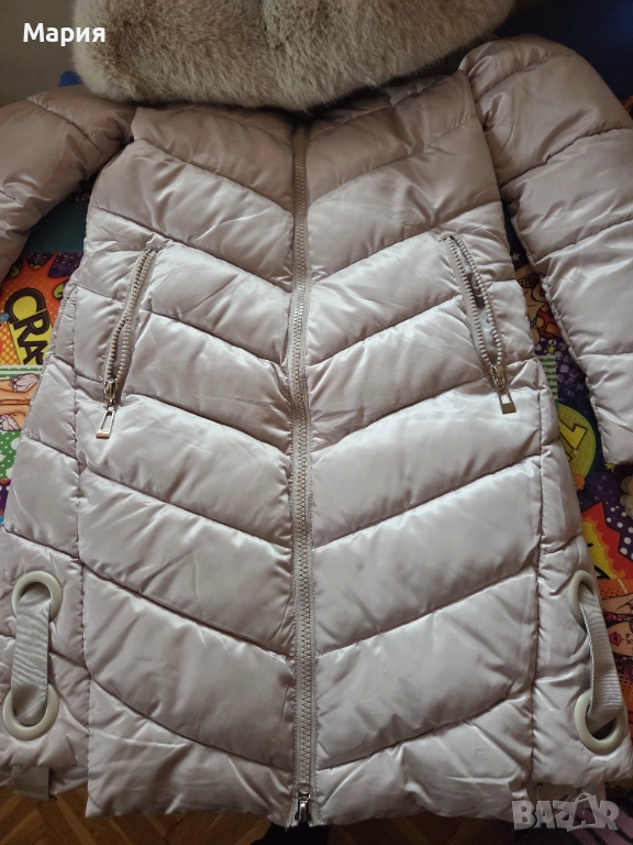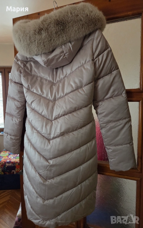 Якето е обличано веднъж но ми е малко. Става за С и за ХС размер. Дълго е една педя под коляното, дебело и топло. Много е хубаво в светло бежав цвят.