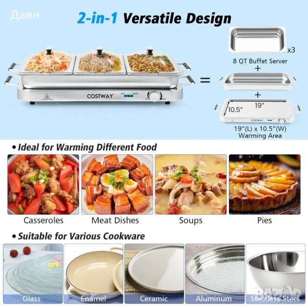 Електрически котлон за затопляне на храна 3в1 COSTWAY , съд за затопляне до 150 °C, 450 W, 9L, затоплящ плот за бюфет