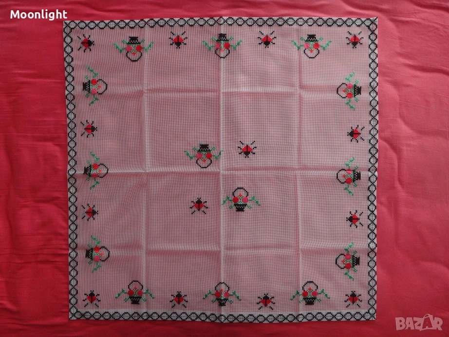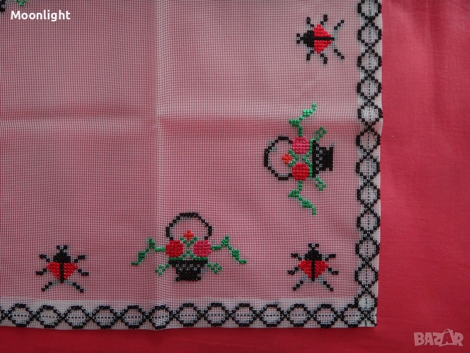 6. Тюлена покривка с бродерия в черно, червено и зелено, нова, размер: 70/68см - 50лв.