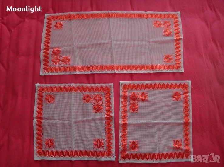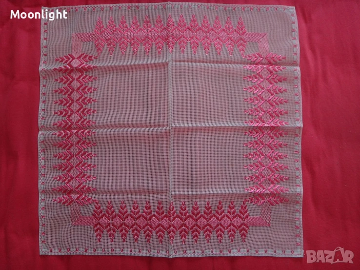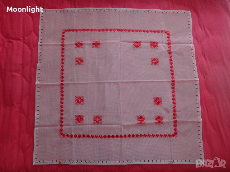 2. Тюлена покривка с бродерия в червено, размер: 67/67см - 30лв.