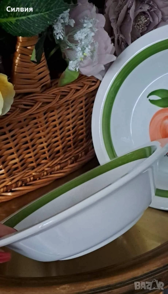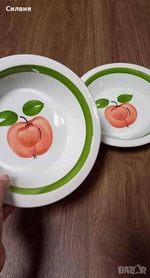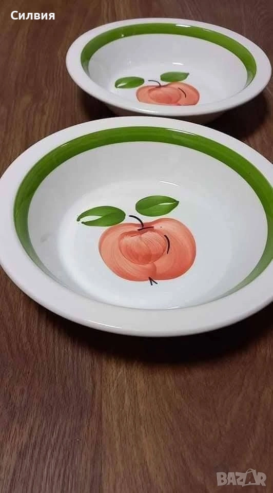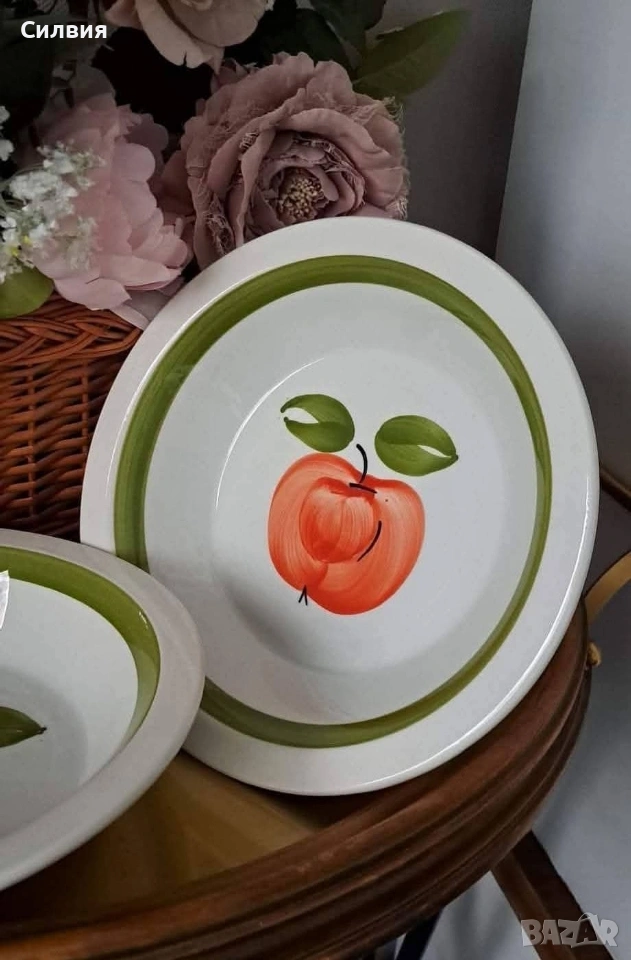 🍎 Комплект 2 Бр. Еднакви Чинии с Плодов Мотив - Ръчно Рисувани, Рустик Стил Комплект от 2 броя чинии с ръчно рисуван плод (праскова или ябълка) и широк зелен кант. Диаметър на всяка чиния: 24 см. Очарователен комплект от две дълбоки чинии с жизнерадостен, рустикален дизайн. Мотивът е ръчно рисуван, което придава уникалност на всяка чиния. Плодът в центъра е в приятни оранжево-розови тонове, допълнен от свеж зелен кант. Производство: Италия Идеални са за: Сервиране и добавяне на Средиземноморски или винтидж акцент във вашата кухня или трапезария. Чиниите са в отлично състояние, без видими пукнатини, счупвания или драскотини. Гланцираната глазура е запазена. Цена за комплекта (2 бр.- 2️⃣0️⃣€) 39,12лв ❥⊱╮🩷☆♪ ░─❥⊱🩷✿L░o░V░e░❥─❥⊱🩷✿⊱╮🩷☆♪ღ