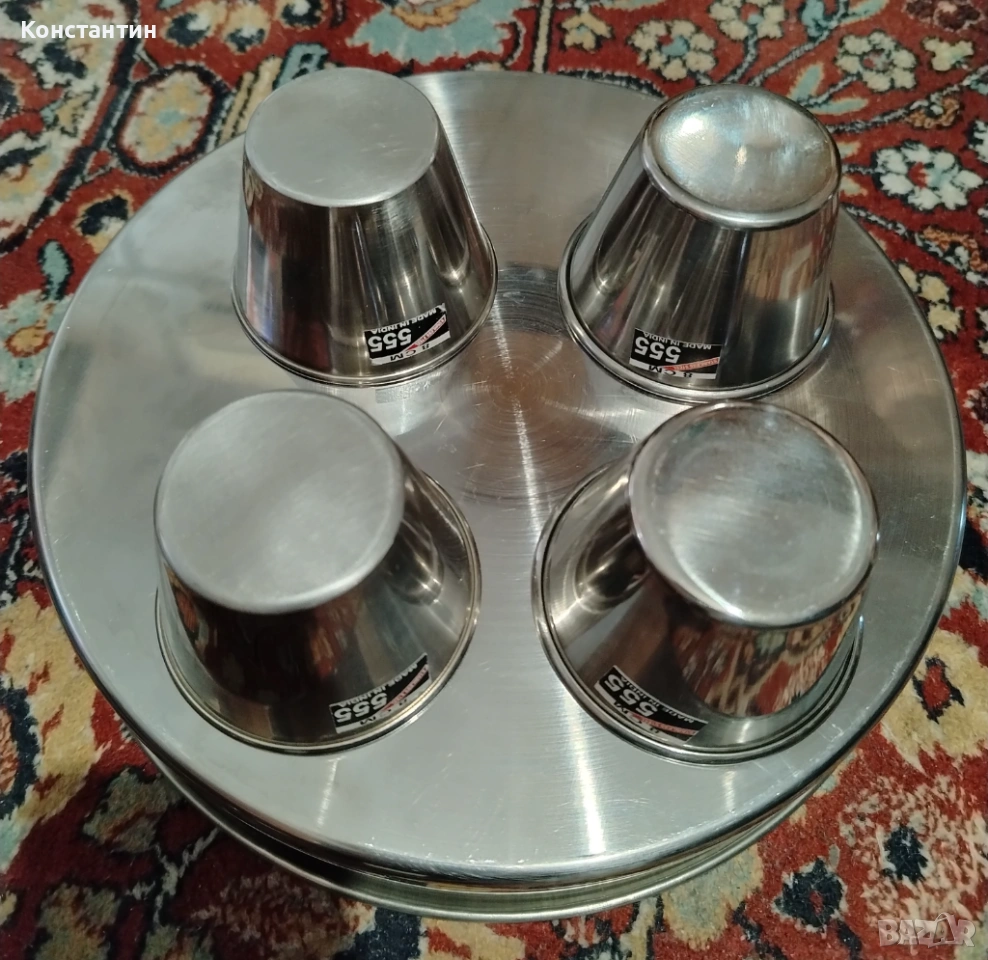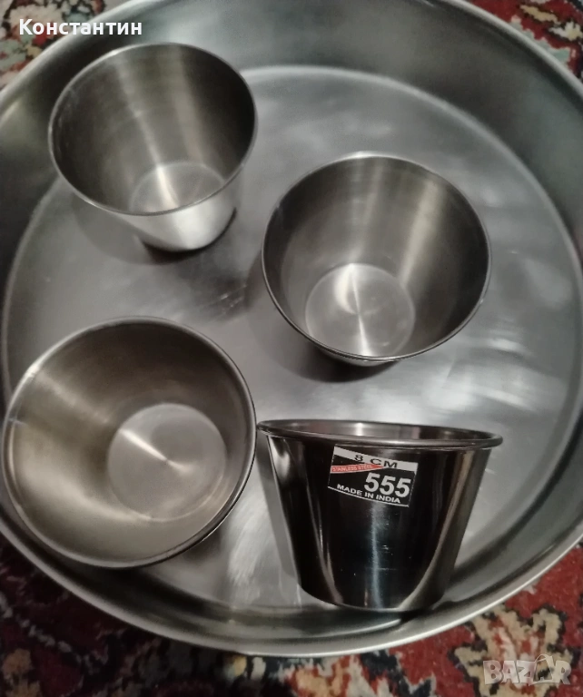 Тава и 4 купички от неръждаема стомана 555, произведени в Индия.